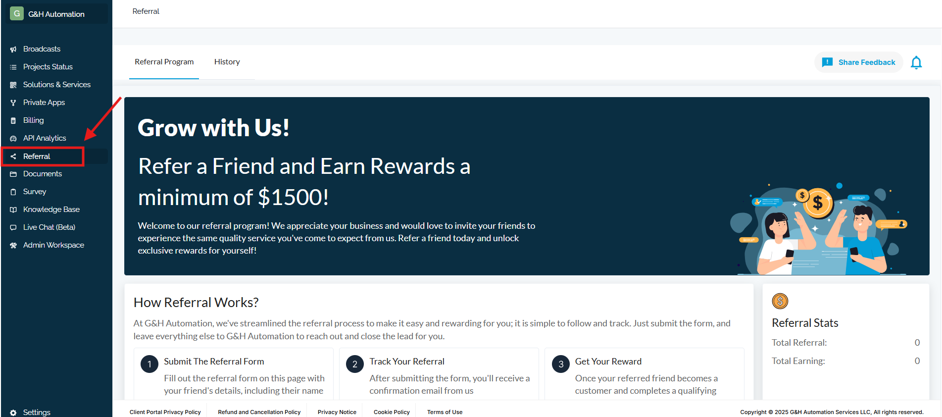 Your referrals can be easily accessed in the referral history section of the client portal. You can follow the instructions below to access your referral history.