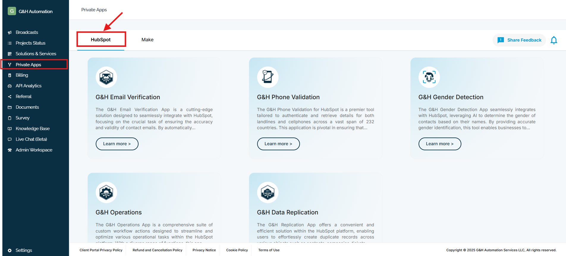 Image showing HubSpot Apps within the G&H Automation Client Portal