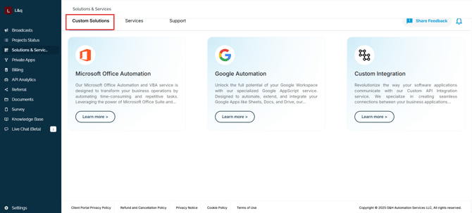 The client portal offers a range of powerful, tailor-made solutions designed to streamline operations and boost productivity. At GnH Automation, we specialize in delivering cutting-edge custom automation tools, including Microsoft Automation, Google Automation, and bespoke integration solutions tailored to your business needs. Each solution is crafted with precision to enhance workflows, reduce manual effort, and drive efficiency.