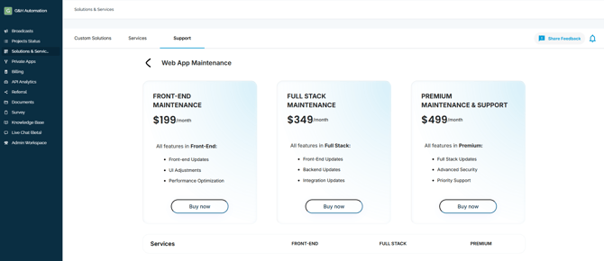 G&H Automation’s Web App Maintenance Service ensures your digital platforms run smoothly, securely, and efficiently. With flexible plans—Front-End, Full Stack, and Premium—we cover everything from UI enhancements and performance optimization to backend updates, database tuning, integration management, and advanced security. Each tier is designed to meet specific business needs, offering regular updates, bug fixes, and proactive support. Whether you're focused on front-end polish or require full-stack reliability and premium support, G&H keeps your web app optimized and future-ready.