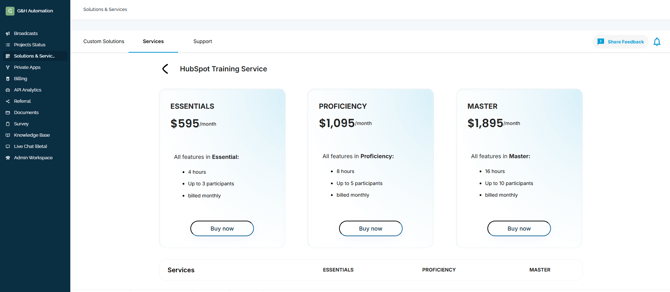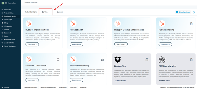 On the other hand, we do provide a range of services that bring a productive workflow and increase efficiencies. In our G&H Automation Client Portal, clients can avail subscriptions of to different services such as HubSpot Onboarding, HubSpot Implementation, HubSpot Auditing, CRM Data Migration, and more. They come under different packages, pricing, and purposes. Let's talk about these services in more detail.