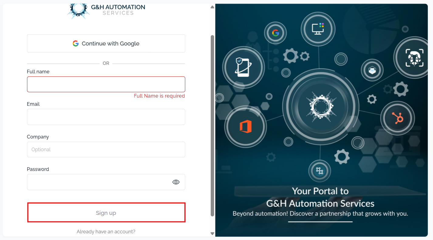 Enter your full name, Email, Company name, and password. After that, click on Sign up to continue.