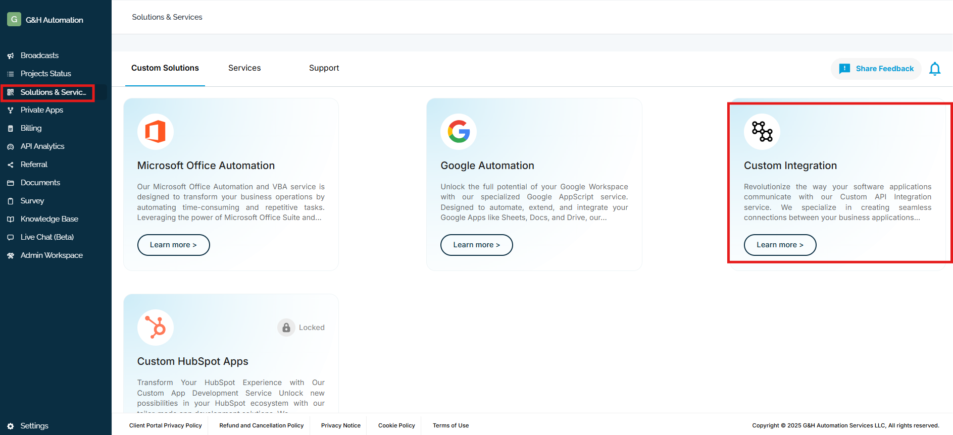 Once logged in, navigate to: Solutions & Services → Custom Integration