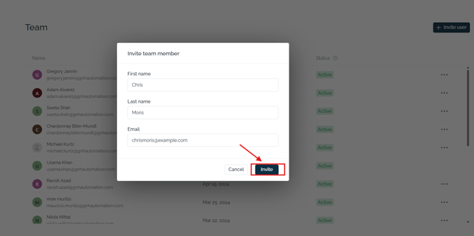 Upon clicking on Invite Users, a form will pop up to provide the details. Once you have entered the details, click on invite and the invitation email will be sent to the receiver mail address.